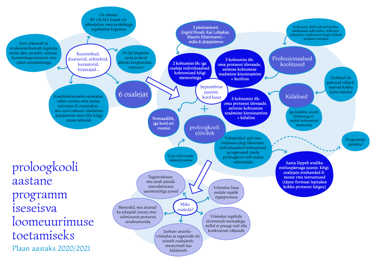 Septembrist juunini toimuvatel igakuistel kohtumistel annavad osalejate vahepealsele tööle ja tekkinud ideedele tagasisidet Ingrid Ruudi, Kai Lobjakas ja Maarin Ektermann, lisaks kogu grupp ning kutsutud külalised; vahepealset iseseisva töö perioodi aitab järje peal hoida spetsiaalselt välja töötatud nn töövihik. Iga osaleja paneb paika oma eesmärgid ning tööplaani, proloogkoolil on selle protsessi juures toetav ja struktureeriv roll.
